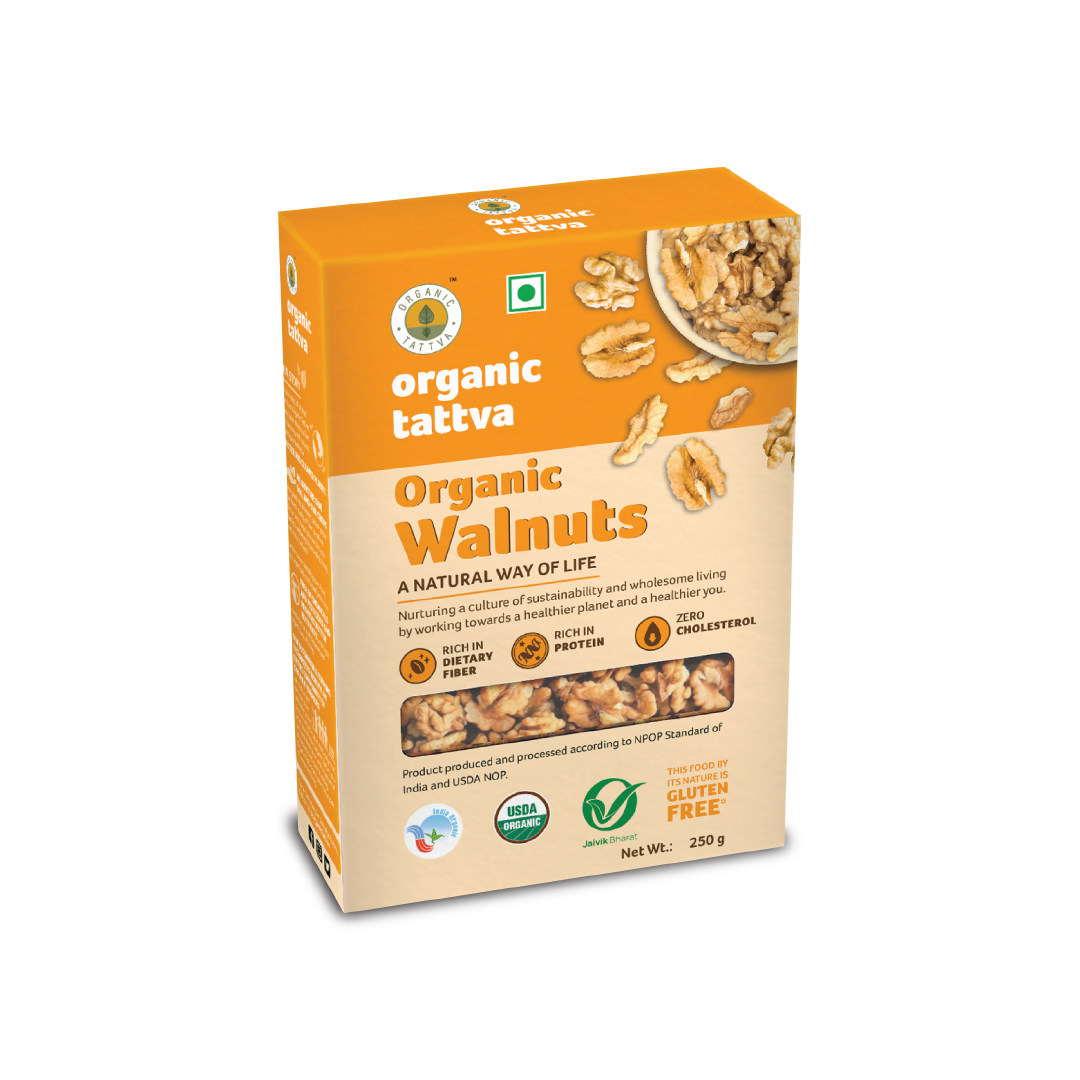 Organic Walnuts by Organic Tattva are filled with the goodness of protein and dietary fibres. One serving of Organic Walnuts contains 0g trans-fat and 0mg cholesterol and can fulfil your hunger cravings. These walnuts from the valley of Kashmir, are flavourful and are also a great addition to baked treats like cakes and brownies. If it’???s a healthy way of life you wish to live, switch to Organic Walnuts by Organic Tattva. ’??ƒ?§ Source of protein’??ƒ?§ Boosts immunity’??ƒ?§ Rich in dietary fibre’??ƒ?§ Zero cholesterol