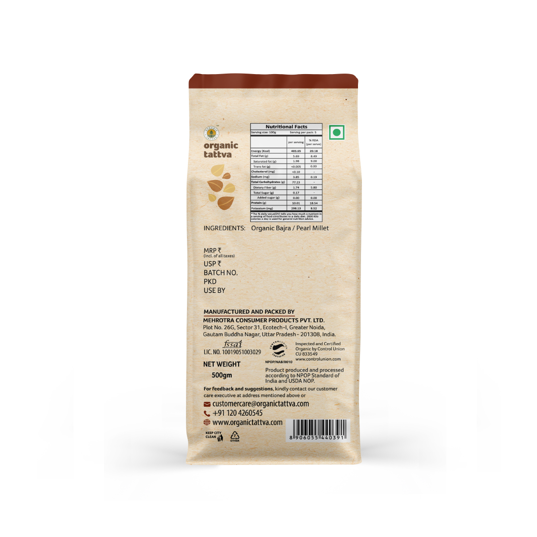 Also known as pearl millet, bajra atta is a great source of energy and is rich in insoluble fibre. As a result, it aids digestion effectively. Organic Tattva’???s Organic Bajra Flour is full of iron, calcium, and protein, which your family needs on a daily basis. Since it’???s entirely gluten-free, it’???s a great alternative to wheat, especially for people with celiac disease and gluten allergies. Processed with the utmost care in a hygienic environment, this atta is extremely nutritious and wholesome and recommended to be consumed every day. ’??ƒ?§ Gluten-free’??ƒ?§ 100% vegan’??ƒ?§ No additives’??ƒ?§ Zero cholesterolIdeal for making rotis, bhakri, bajre ki tikki and cookies