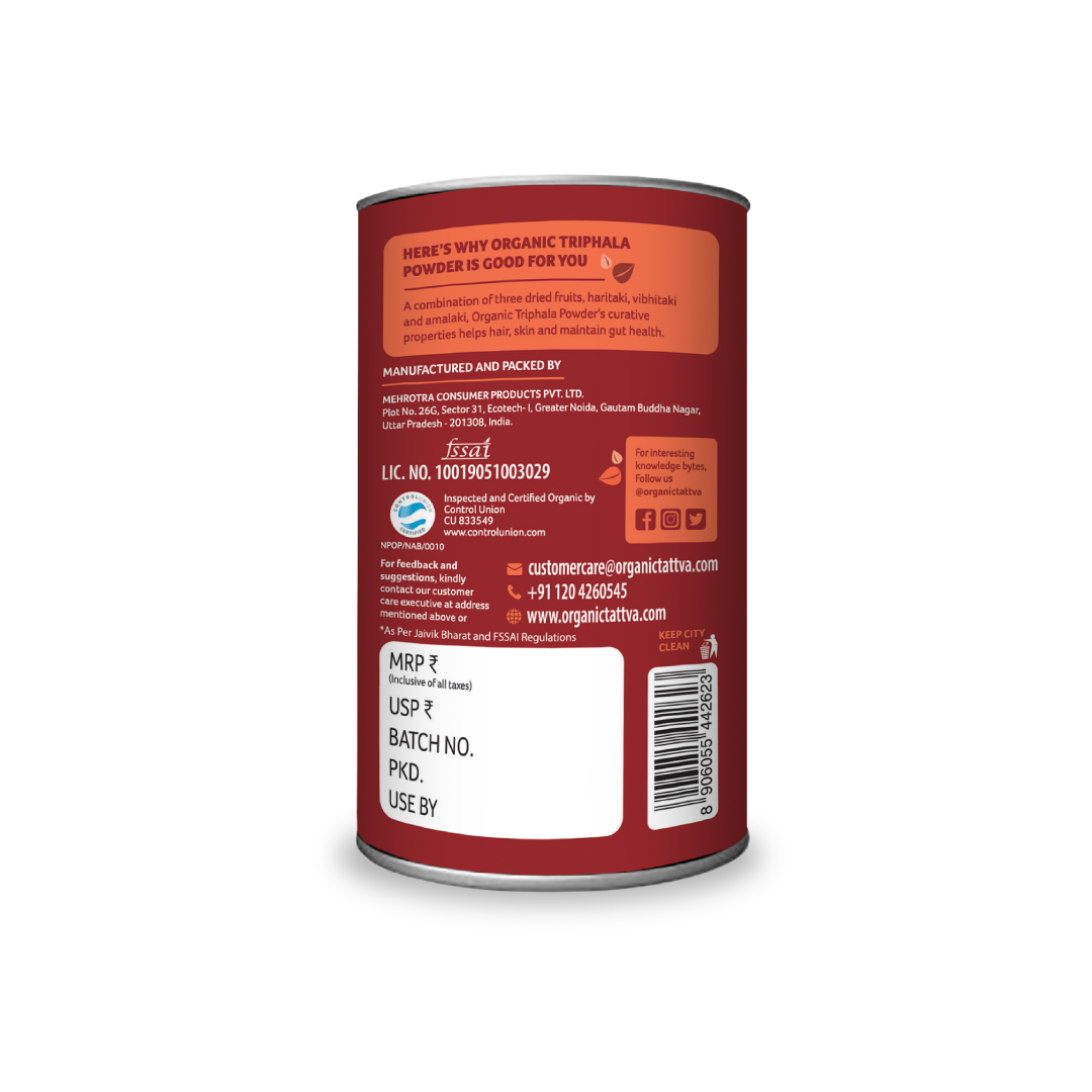 A naturally-detoxifying and cleansing powder of three dried fruits, haritaki, bibhitaki and amalaki, Organic Triphala Powder has immense curative properties. Essentially, it helps build immunity and keeps you healthy! A great source of calcium, potassium, and protein, Organic Tattva’???s Organic Triphala Powder aids digestion, improves your blood circulation, helps in weight loss, and regulates blood pressure. For best results, consume it every night, before going to bed by adding ??® TSP to 1 cup of warm water, sweetened with a little honey if you prefer it sweet.