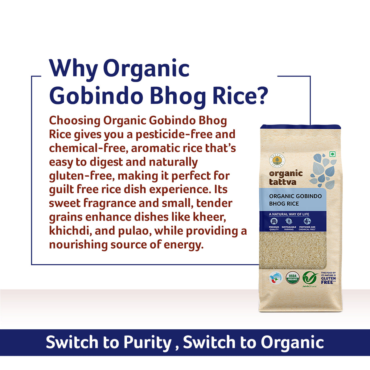Often referred to as the Prince of Rice owing to its aroma and nutty flavour, Gobindo rice is a staple in the state of West Bengal, which has been allotted a geographical indication tag by the Government of India. This short-grain, sticky organic rice is easily digestible and helps improve bowel movement. Organic Gobindo Bhog Rice is perfect for making delicious pulao, khichdi and mishri pulao.
