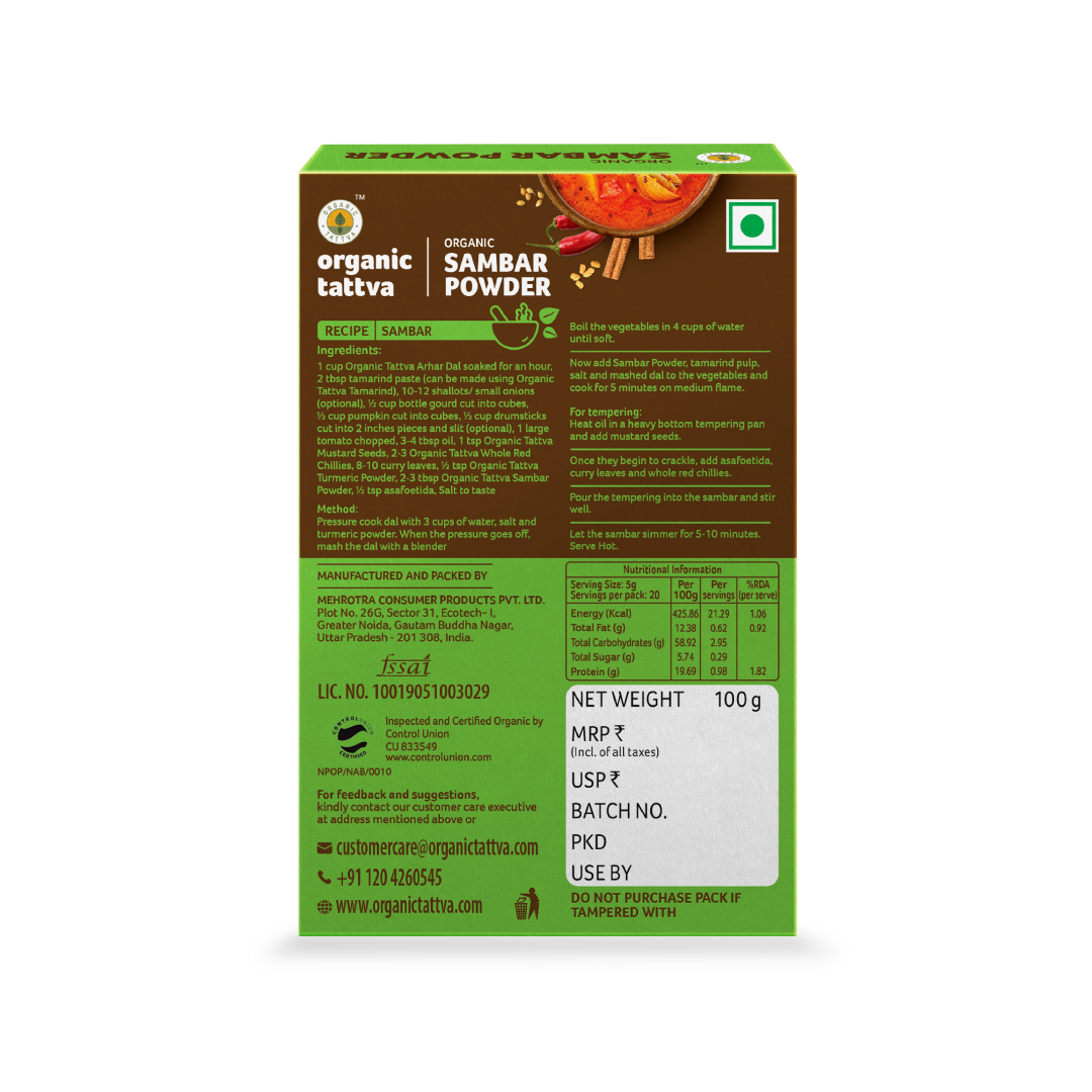 Dry-roasted, aromatic blend of assorted spices, Organic Sambar Powder by Organic Tattva helps you dish out the most fragrant and delicious sambar ’??? the perfect accompaniment for rice, idlis, dosas, etc. ’??ƒ?§ Made from whole spices’??ƒ?§ Dry roasted’??ƒ?§ No additives’??ƒ?§ Rich flavour and aroma