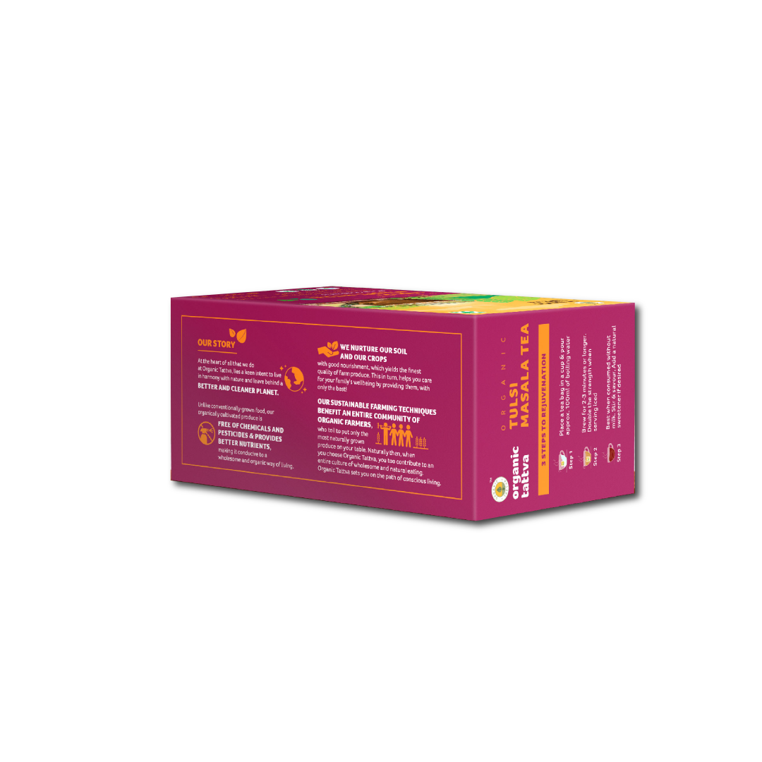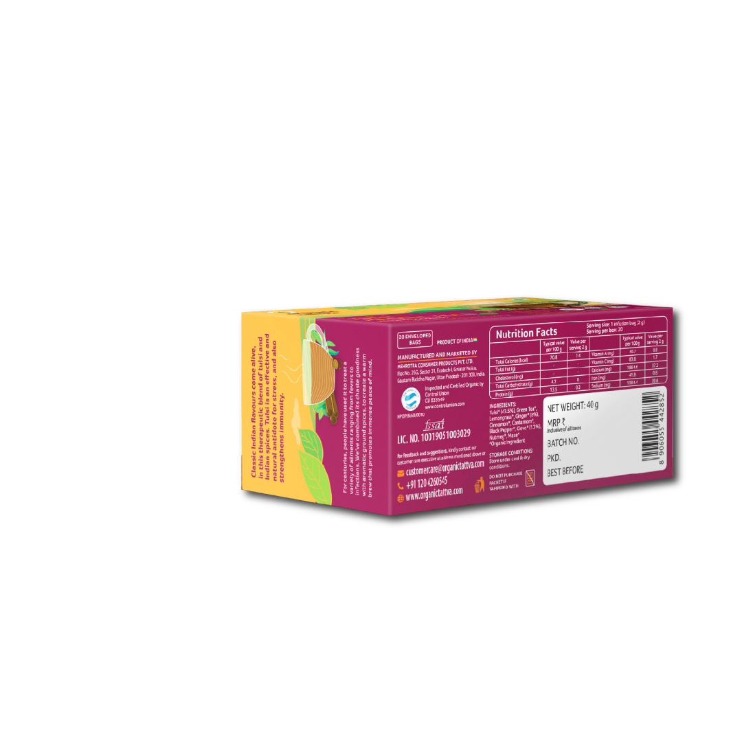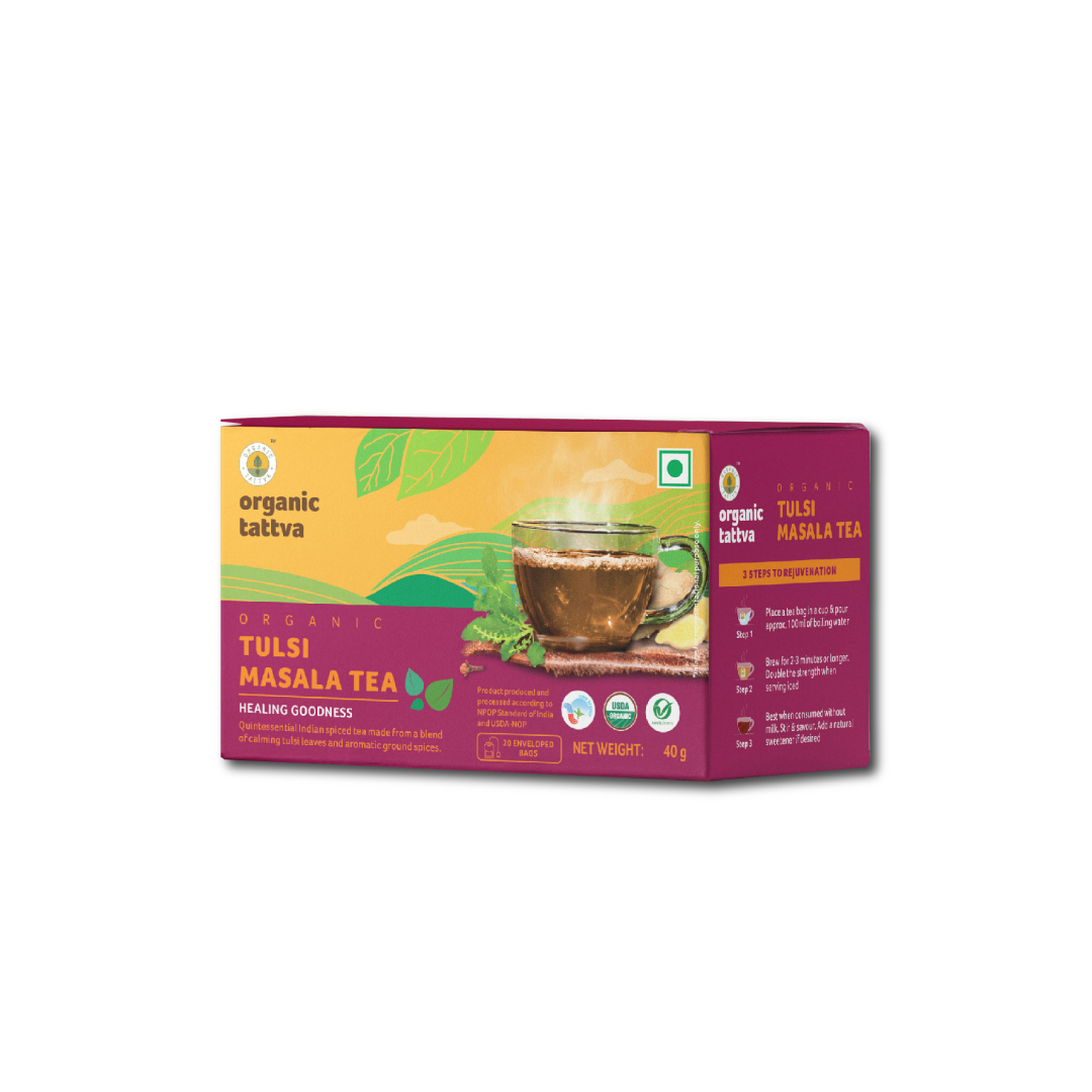 Classic Indian flavours come alive, in this therapeutic blend of tulsi and Indian spices. Tulsi is an effective and natural antidote for stress, and also strengthens immunity. For centuries, people have used it to treat a variety of ailments ranging from fevers to infections. We’???ve combined its pure goodness with quintessential aromatic ground Indian spices, to create a warm brew that promotes immense peace of mind. Savour this fine a blend of calming tulsi leaves and aromatic spices with a dash of Organic Tattva Honey, any time of the day!