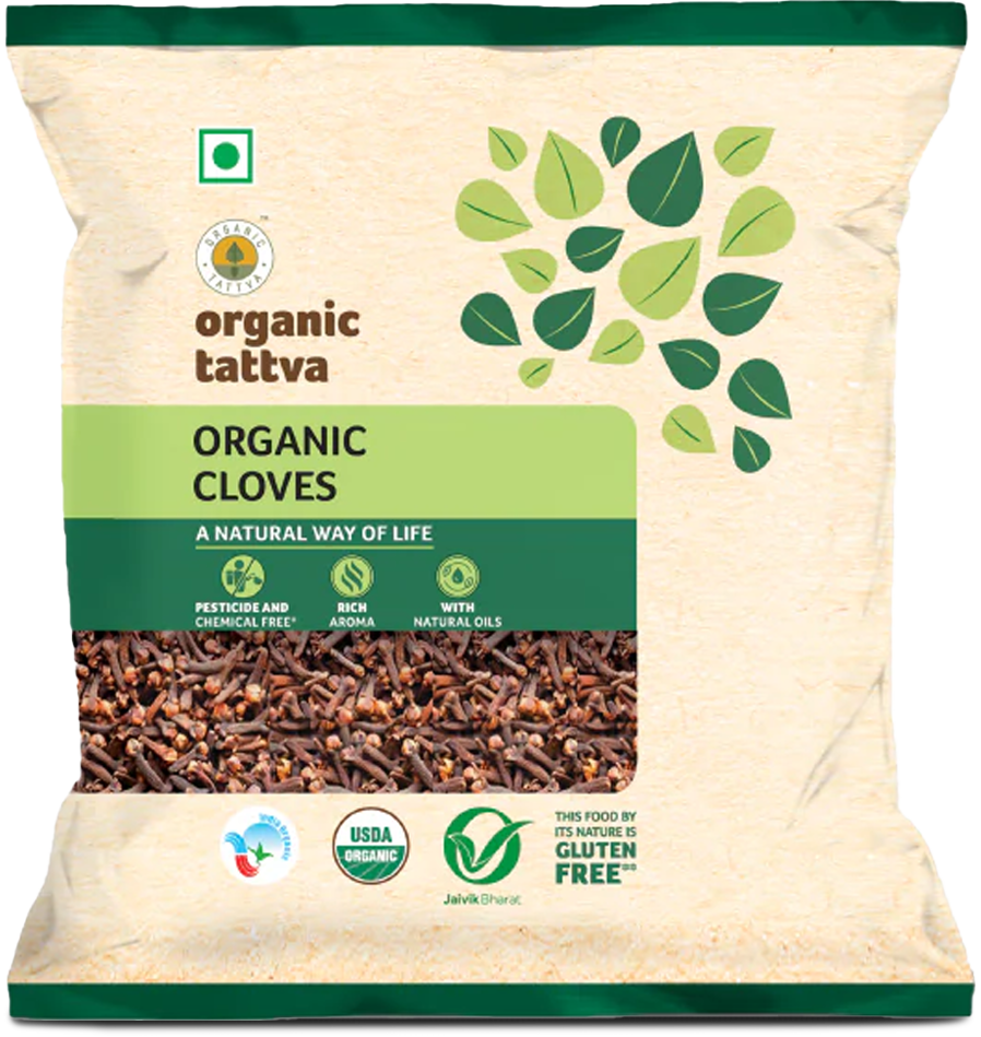 Organic cloves are dried aromatic flower buds of the clove tree. They are known for their strong aroma and warm, spicy flavour. Cloves are also called laung in Hindi, lavanga in Marathi, and lawang in some other Indian regions.