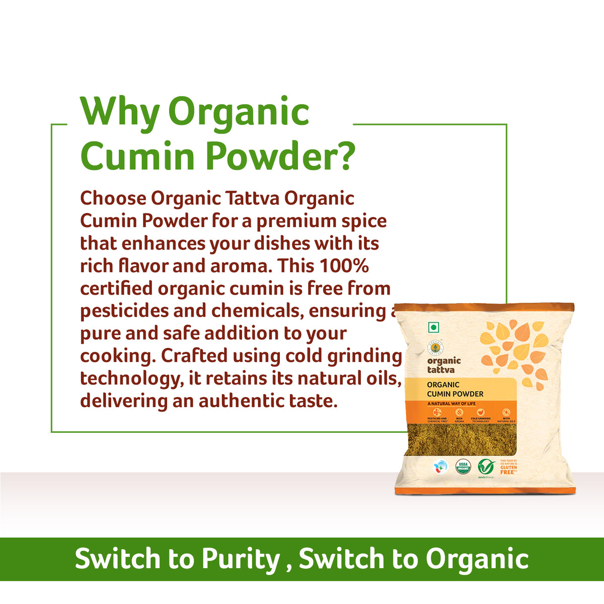 Pure and unadulterated, Organic Tattva's Organic Cumin powder is obtained from grinding a hand-picked selection of cumin seeds to a fine powder. Known to be rich in iron and antioxidants, cumin is also known to aide digestion and is therapeutic for the skin. Organic Cumin Powder has a deep earthy and mildly pungent flavour, which makes it perfect for both meat and vegetable dishes.’??ƒ?§ 100% vegan’??ƒ?§ No additives’??ƒ?§ Gluten-free