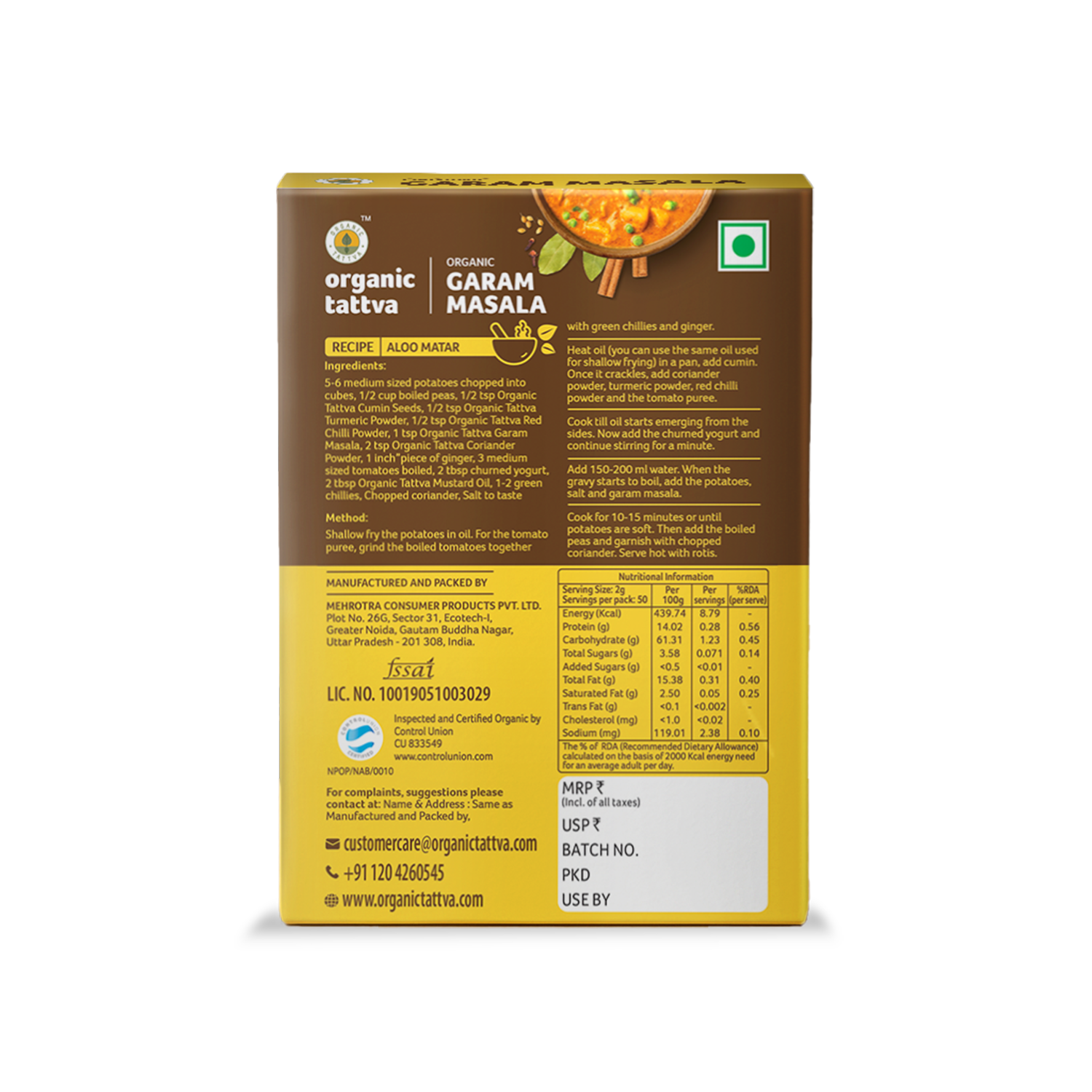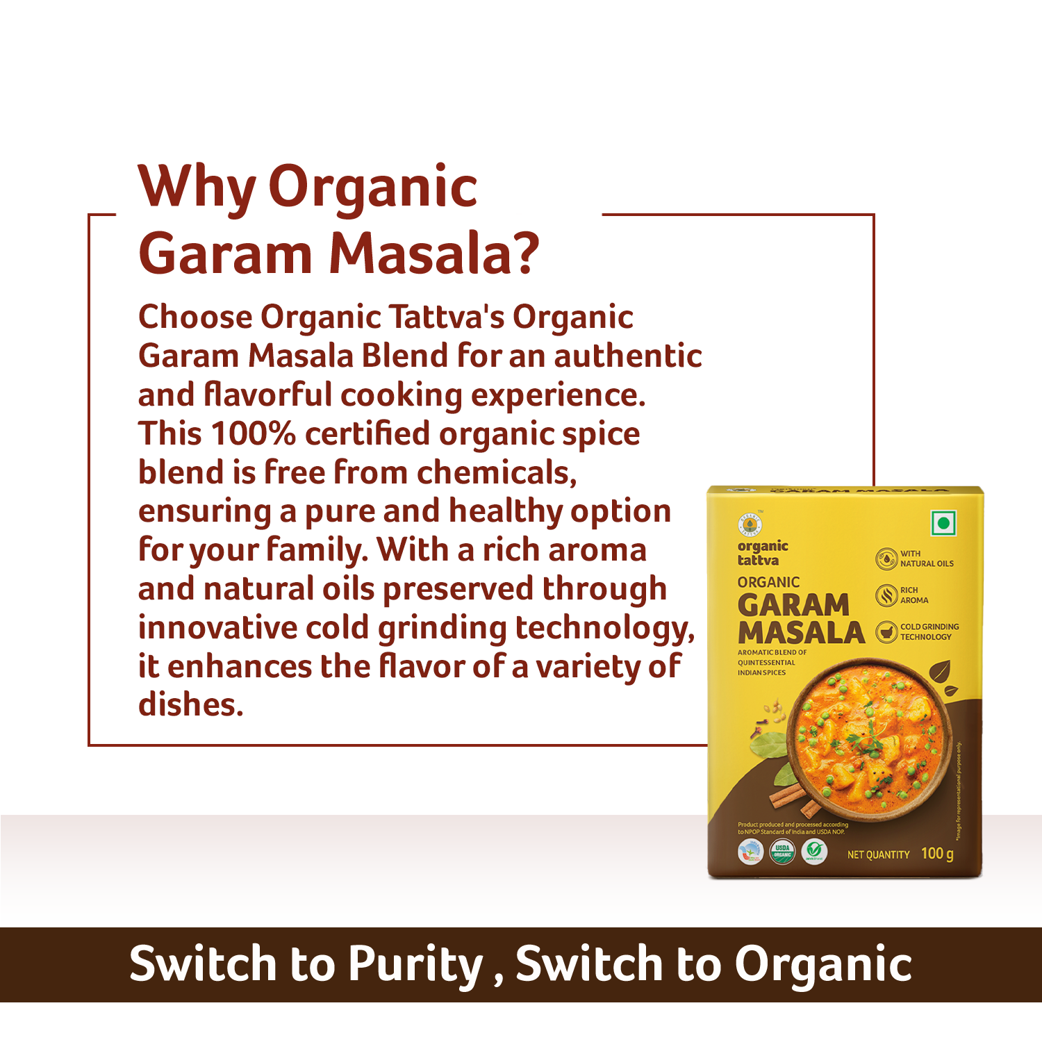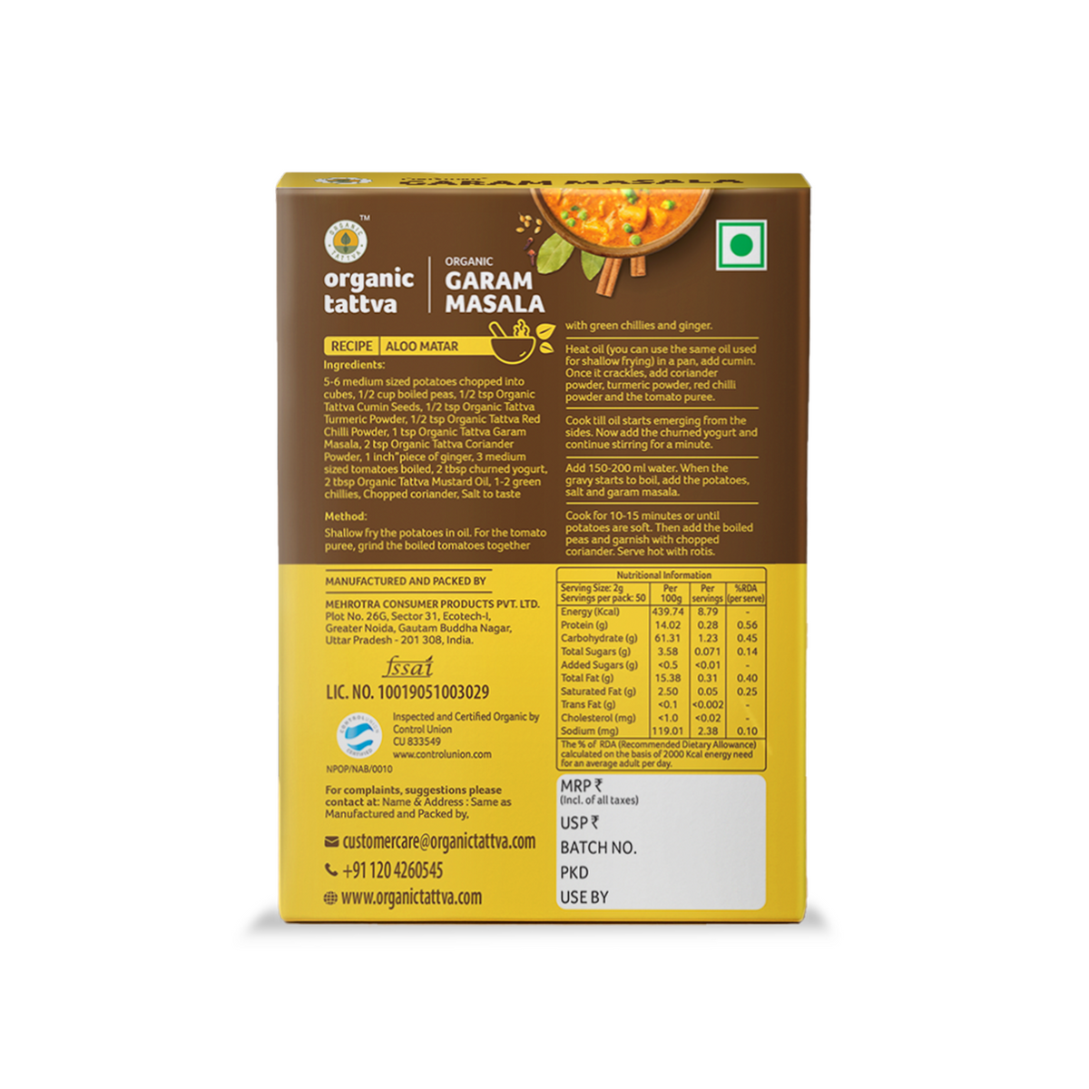 Organic Garam Masala by Organic Tattva is a fragrant blend of carefully selected whole organic spices, dry roasted and finely ground to deliver authentic Indian flavour.