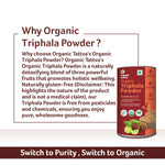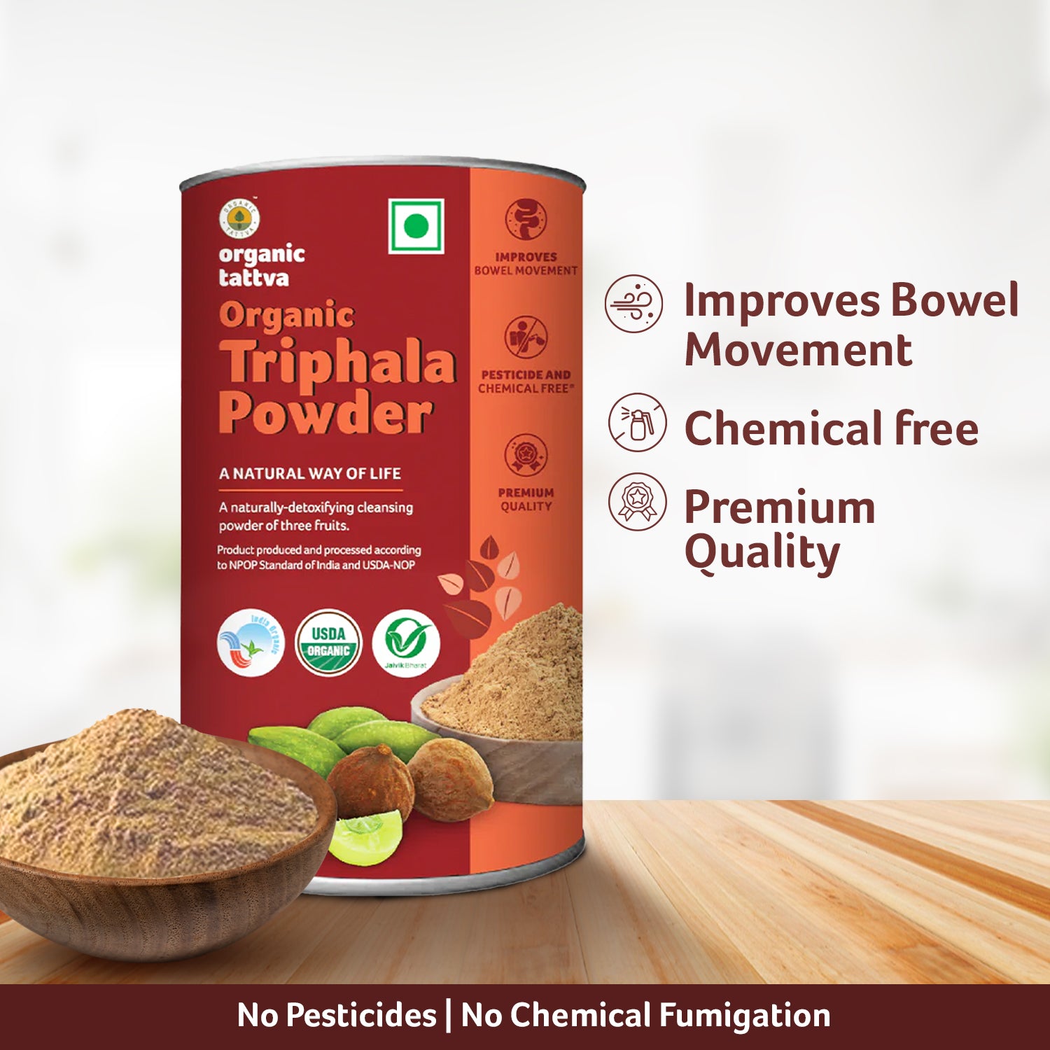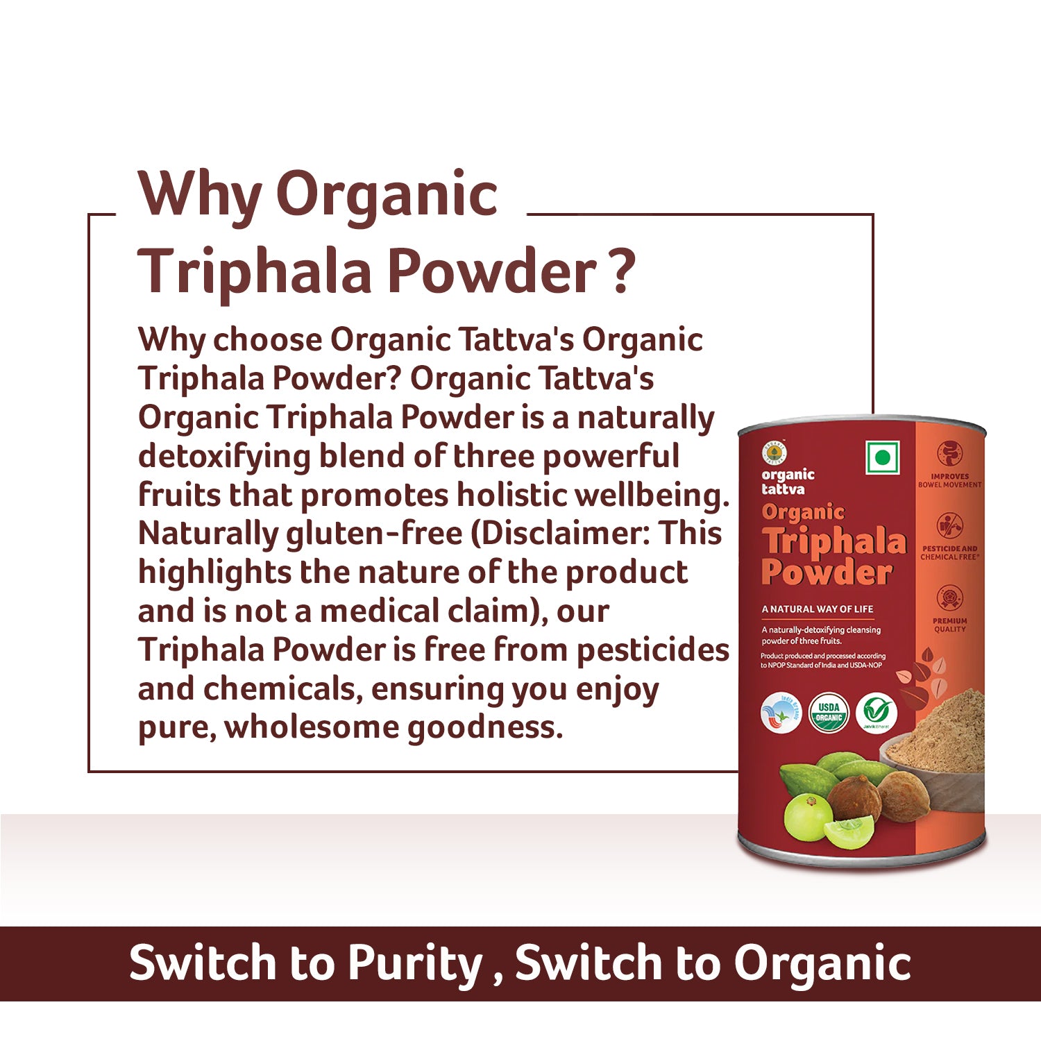 A naturally-detoxifying and cleansing powder of three dried fruits, haritaki, bibhitaki and amalaki, Organic Triphala Powder has immense curative properties. Essentially, it helps build immunity and keeps you healthy! A great source of calcium, potassium, and protein, Organic Tattva’???s Organic Triphala Powder aids digestion, improves your blood circulation, helps in weight loss, and regulates blood pressure. For best results, consume it every night, before going to bed by adding ??® TSP to 1 cup of warm water, sweetened with a little honey if you prefer it sweet.