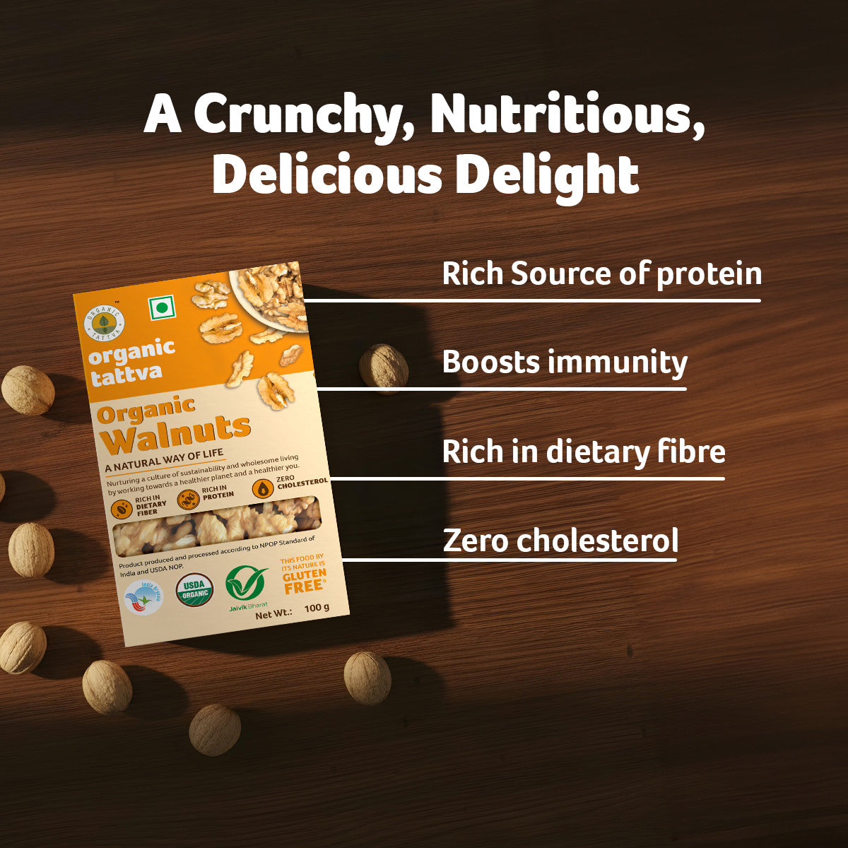 Organic Walnuts by Organic Tattva are filled with the goodness of protein and dietary fibres. One serving of Organic Walnuts contains 0g trans-fat and 0mg cholesterol and can fulfil your hunger cravings. These walnuts from the valley of Kashmir, are flavourful and are also a great addition to baked treats like cakes and brownies. If it’???s a healthy way of life you wish to live, switch to Organic Walnuts by Organic Tattva. ’??ƒ?§ Source of protein’??ƒ?§ Boosts immunity’??ƒ?§ Rich in dietary fibre’??ƒ?§ Zero cholesterol