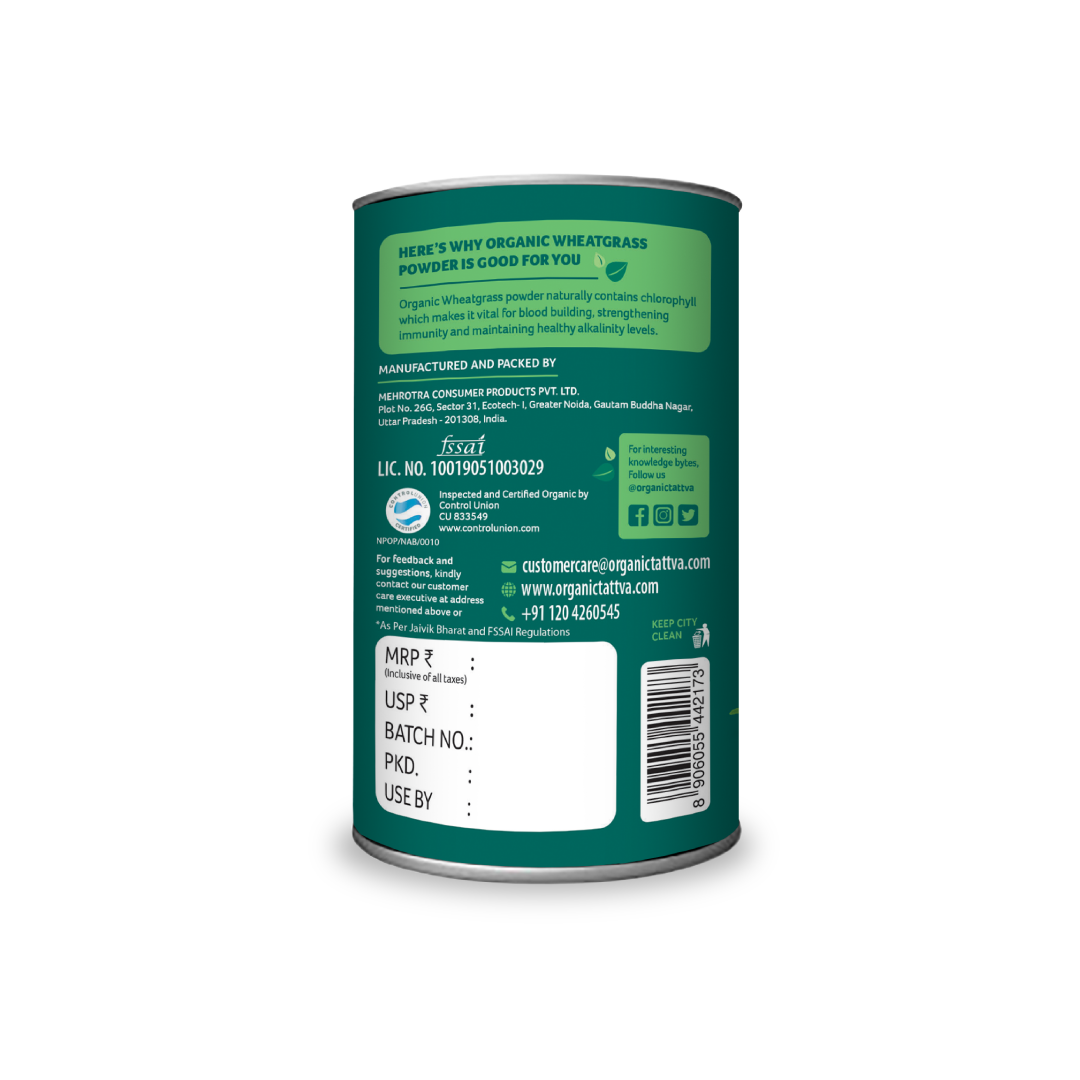 Obtained from grinding wheat sprout leaves, Organic Wheat Grass Powder is a great immunity booster that is packed with vitamins, minerals, and antioxidants. It also contains high levels of chlorophyll, which plays an important role in blood building and strengthening immunity. Consume it every day, by making a delicious smoothie? blend in 1 TBS of Organic Wheat Grass Powder with yoghurt, honey, milk, and fruits of your choice. Boosts immunit Aids digestio Eliminates impurities and toxins in the body